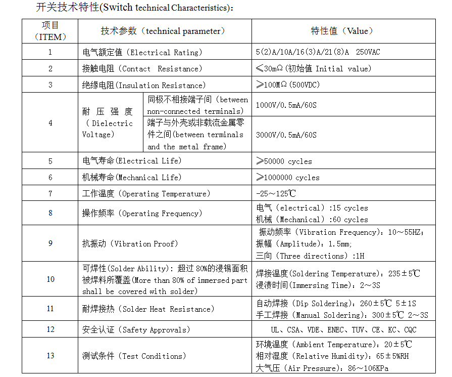 | 1 | Elektrische Bewertung | 5(2)A/10A/16(3)A/21(8)A 250VAC | |